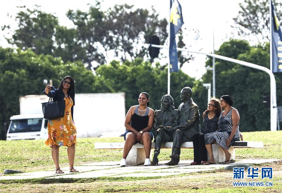 11月8日,在巴西首都巴西利亞,游客在庫比契克紀念館前與巴西前總統(tǒng)庫比契克夫婦的雕像合影。新華社記者 蘭紅光 攝