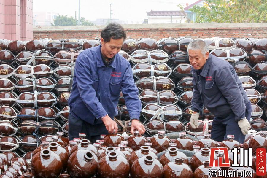 2019年11月13日,江蘇省如皋市白蒲鎮(zhèn)一釀酒廠,工人在對裝滿黃的酒壇進行過濾沉淀檢查。