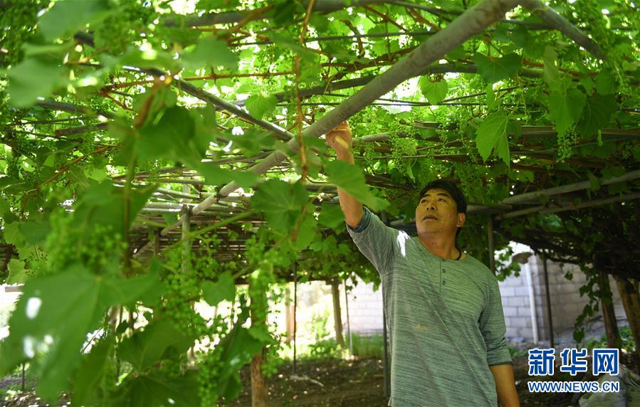 建廠生產并注冊“丁德良”牌干紅葡萄酒品牌的魯仁弟介紹他家里一棵樹齡超過百年的葡萄樹(6月3日攝)。新華社記者晉美多吉攝