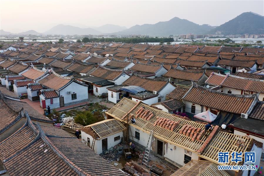 11月14日,埭美村村民在修繕一座古民居(無人機(jī)拍攝)。新華社記者姜克紅攝