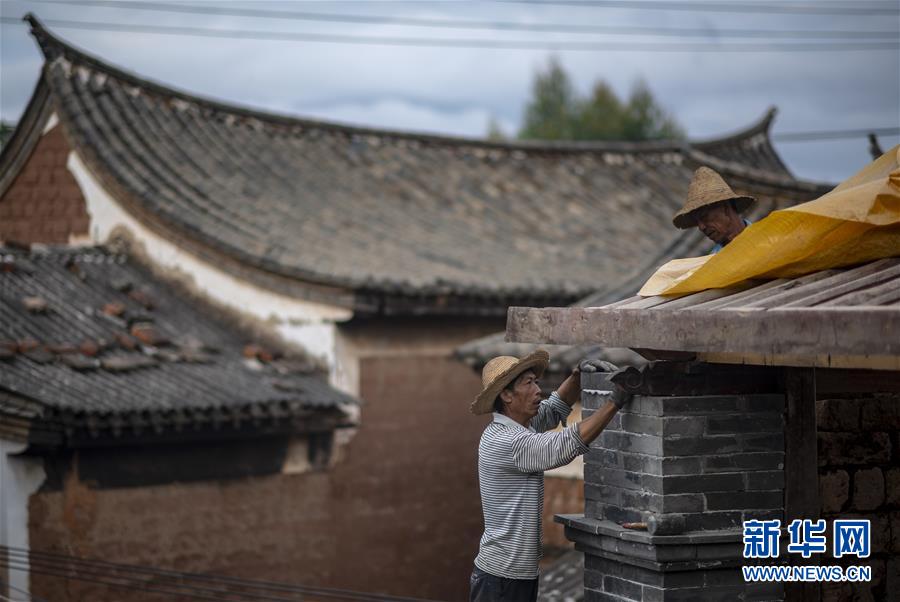 工人邱社云(左)在石屏縣異龍鎮(zhèn)符家營(yíng)村211號(hào)民居修繕圍墻(8月8日攝)。新華社記者江文耀攝