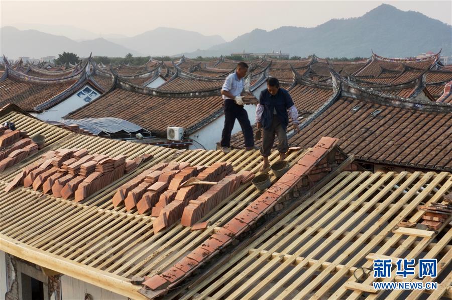 11月14日,埭美村村民在修繕一座古民居(無(wú)人機(jī)拍攝)。新華社記者姜克紅攝