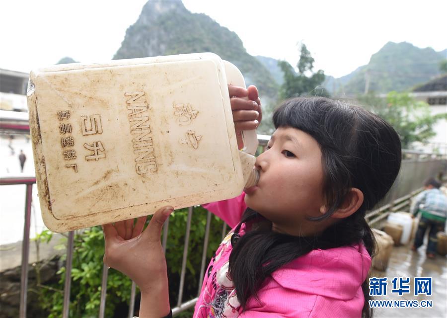在廣西大化瑤族自治縣板升鄉(xiāng)八好小學,一名學生喝水桶里的雨水(2014年11月24日攝)。八好小學有400多名學生,曾僅有一個不足100立方米的水柜,用于收集儲存樓頂?shù)挠晁瑢W生需定期定量用水。遇到長時間不下雨,學校需要到鄉(xiāng)政府所在地運水。如今,學校修建了5個大水柜,并從兩公里外引泉水到校園,飲水難問題得到解決。新華社記者黃孝邦攝