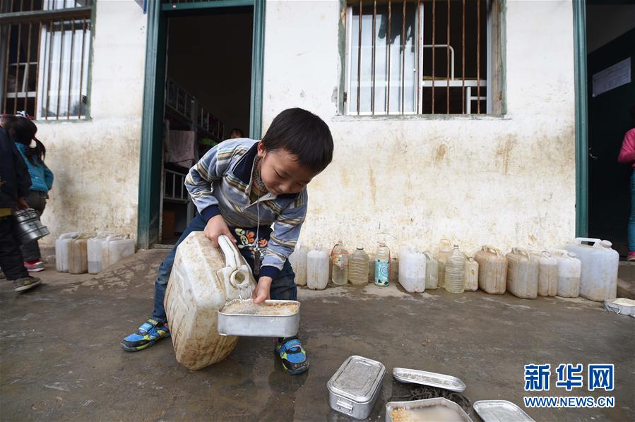 在廣西大化瑤族自治縣板升鄉(xiāng)八好小學(xué),一名學(xué)生用儲備在水桶里的雨水淘米煮飯(2014年11月24日攝)。新華社記者黃孝邦攝