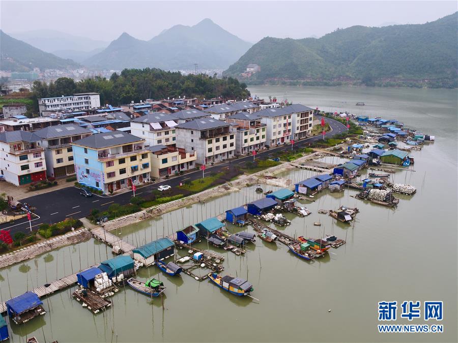 在寧德福安市溪邳村,一艘漁船經(jīng)過岸上新居(3月8日無人機拍攝)。新華社記者姜克紅攝