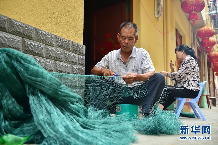 8月22日,福安市下岐村村民江銀章在修補(bǔ)漁網(wǎng)。新華社記者林善傳攝