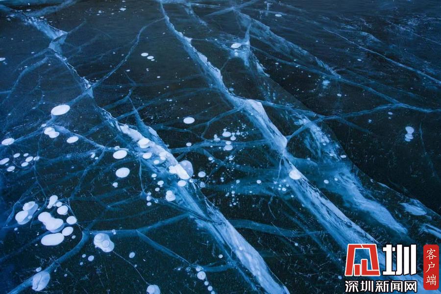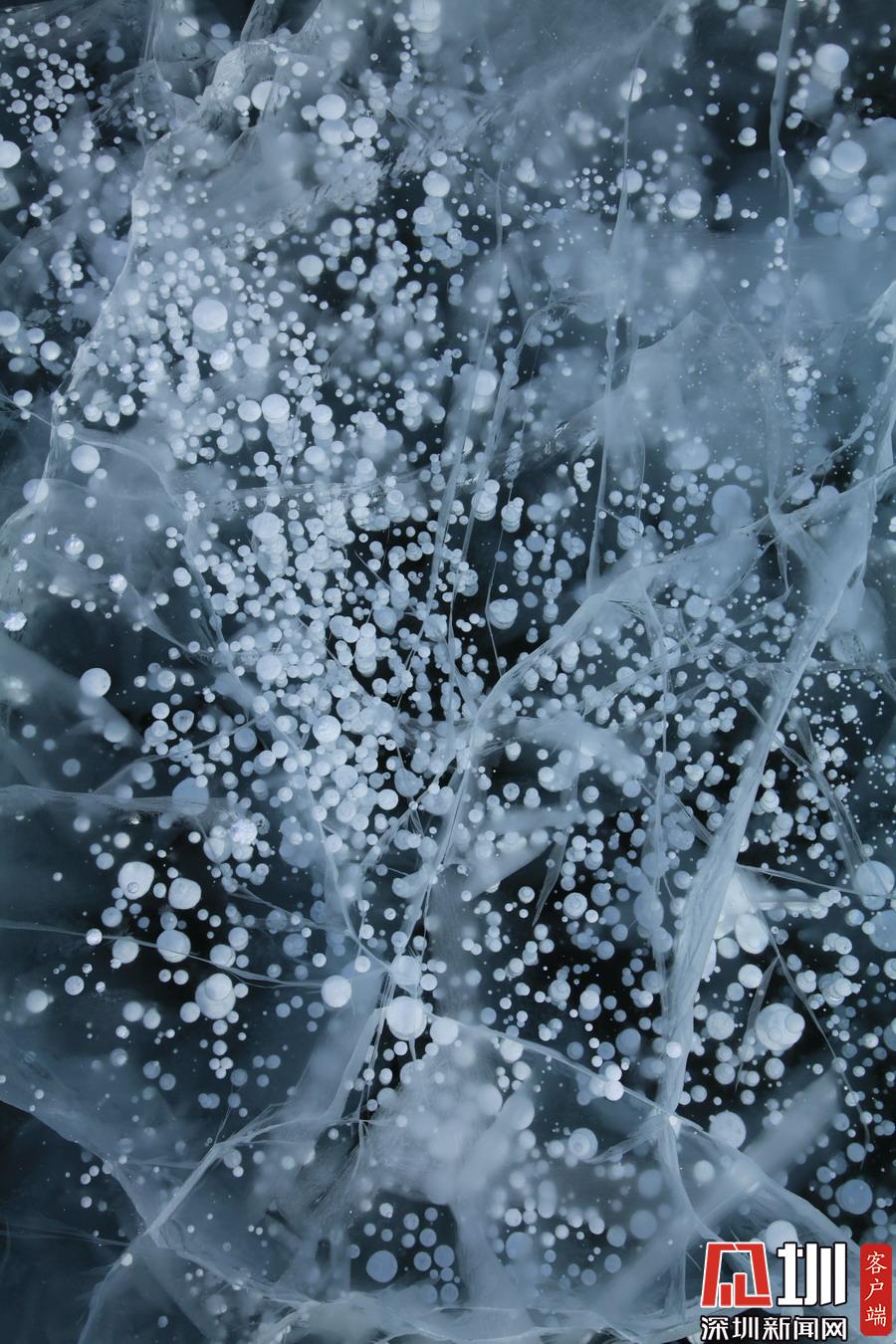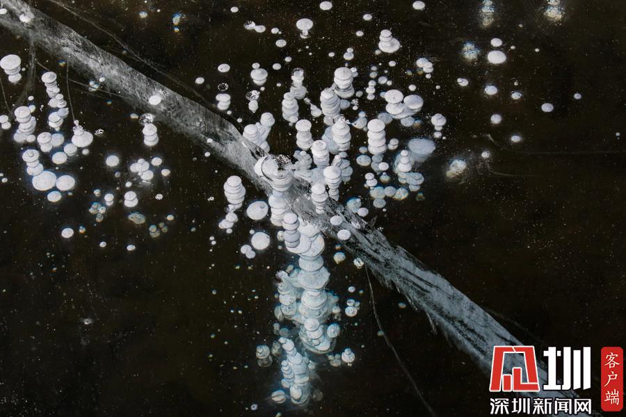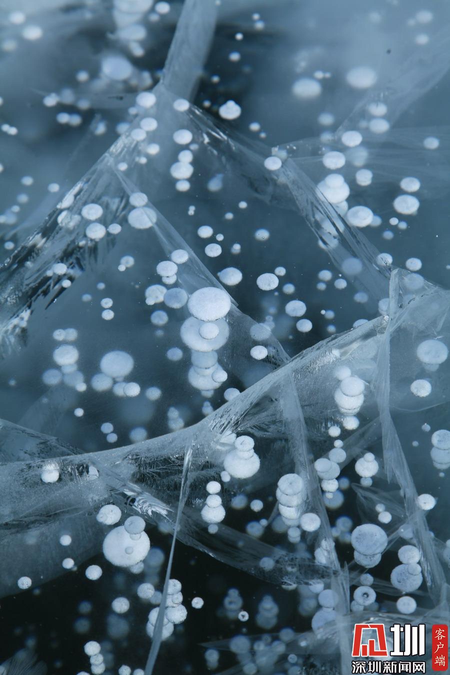 透過晶瑩剔透的冰面,可以看到一串串潔白氣泡分布在冰層中。