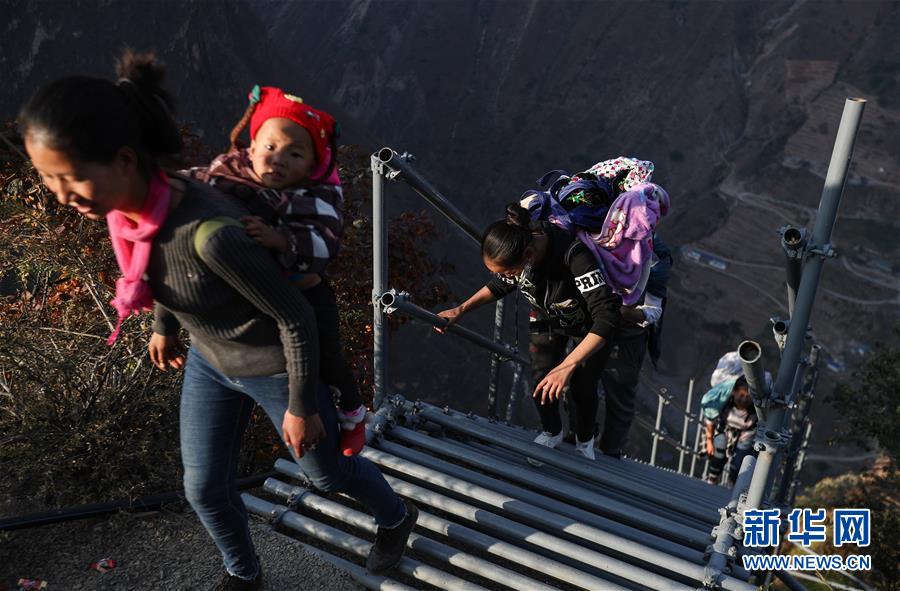 彝族年期間,幾名彝族群眾爬上鋼梯來到阿土列爾村拜年(11月24日攝)。新華社記者江宏景攝
