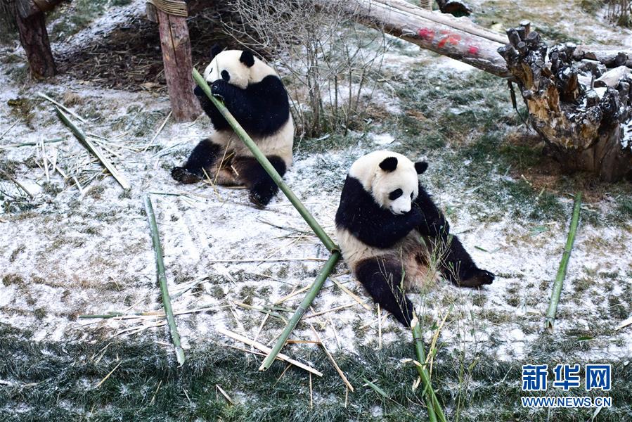 11月29日,在西寧熊貓館內(nèi),兩只大熊貓?jiān)诔灾褡印?當(dāng)日,青海省西寧市迎來(lái)降雪,西寧熊貓館四只“萌寵”大熊貓?jiān)谘┨炖锵硎苤灾褡拥臉啡?。?jù)了解,大熊貓生活的適宜溫度在26攝氏度至零下5攝氏度之間,冬季氣溫低于零下5攝氏度時(shí),場(chǎng)館會(huì)啟用保暖設(shè)施。 新華社記者 吳剛 攝