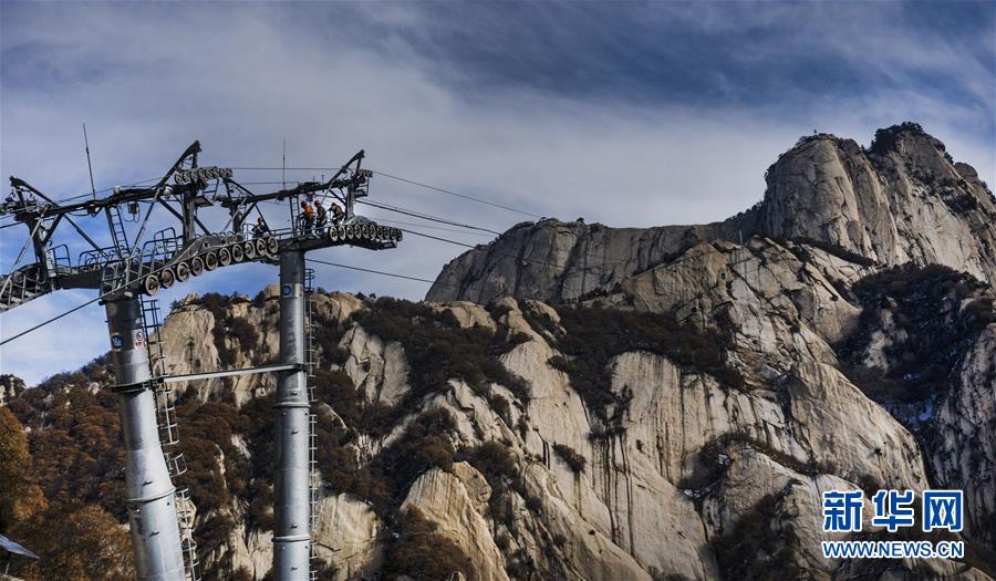 華山太華索道維修人員在進(jìn)行索道支架橫擔(dān)檢測(cè)(12月5日無(wú)人機(jī)拍攝)。新華社記者陶明攝