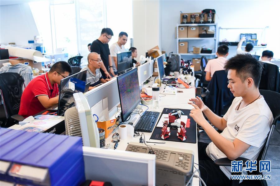 在深圳前海深港青年夢工場,創(chuàng)業(yè)者招俊?。ㄇ坝遥┡c團(tuán)隊成員在辦公室工作(2018年10月25日攝)。 新華社記者 毛思倩 攝