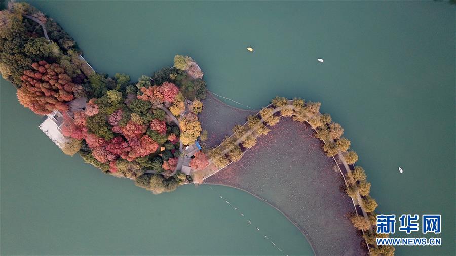 12月10日,小船在湖南烈士公園年嘉湖湖面行駛(無人機拍攝)。新華社記者陳澤國攝