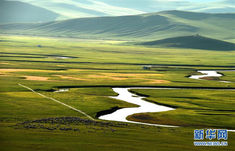 8月29日無人機拍攝的內(nèi)蒙古呼倫貝爾市陳巴爾虎旗境內(nèi)的莫日格勒河與羊群。新華社記者李京攝