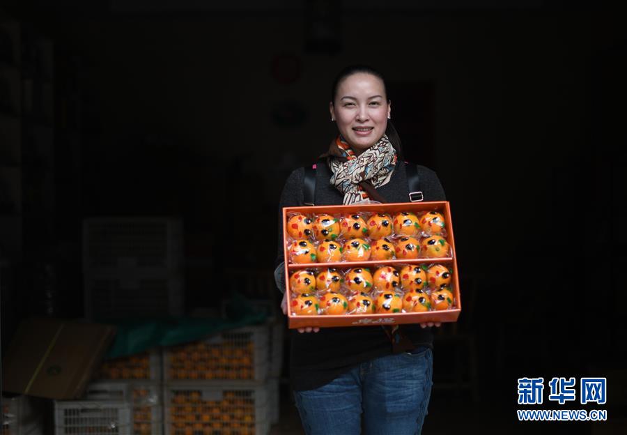 李柳萍在特產(chǎn)館里展示包裝好的鹿寨蜜橙(12月14日攝)。新華社記者黃孝邦攝