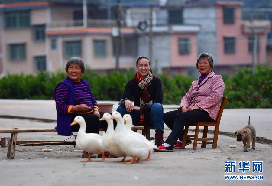 在鹿寨縣拉溝鄉(xiāng)木龍村,李柳萍(右二)在回村采購(gòu)?fù)撂禺a(chǎn)途中和老人們交流(12月14日攝)。新華社記者黃孝邦攝