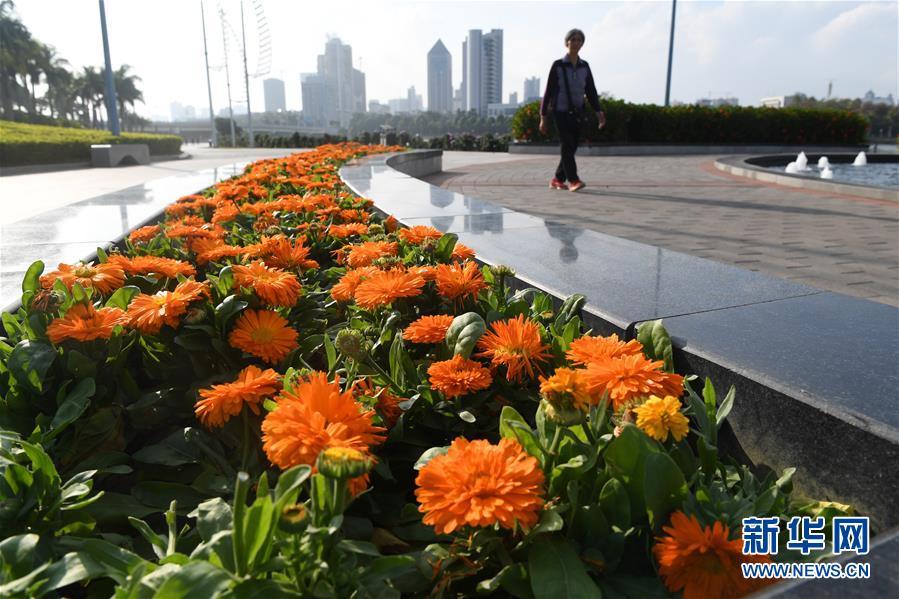 12月17日,市民從南寧市南湖邊綠樹鮮花間走過。新華社記者 陸波岸 攝