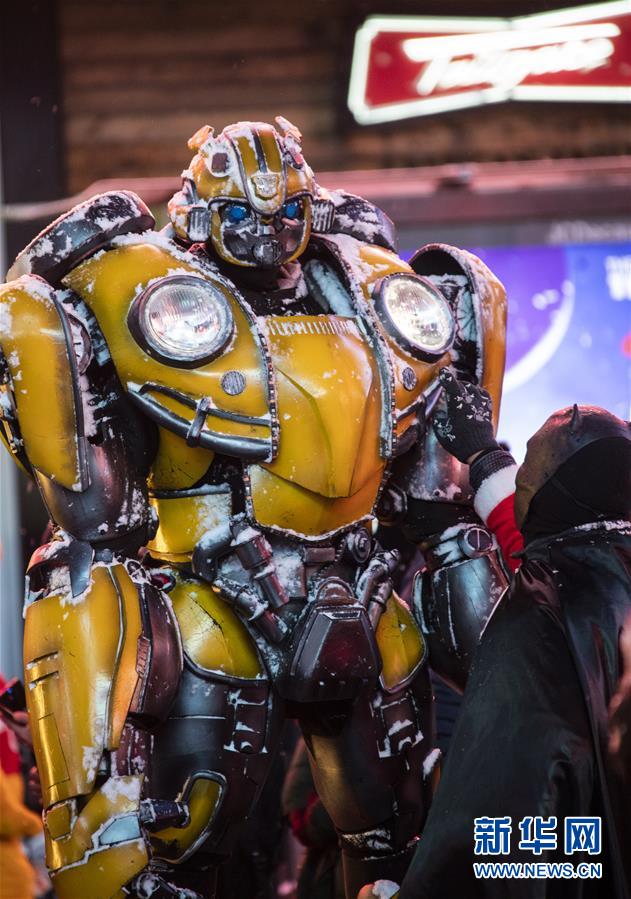 12月18日,在美國(guó)紐約時(shí)報(bào)廣場(chǎng),一名打扮成動(dòng)漫人物的街頭表演者為同伴清理積雪。新華社記者 王迎 攝