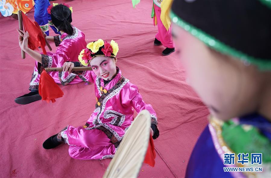 12月19日,河北省灤州市小閆營小學(xué)教師在為排練地秧歌的學(xué)生化妝。新華社記者 牟宇 攝