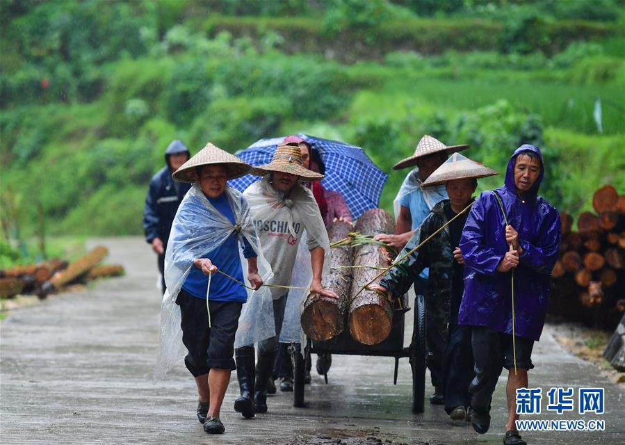 在烏英苗寨,村民在雨中搬運(yùn)木頭,準(zhǔn)備修建新房(7月6日攝)。新華社記者黃孝邦攝