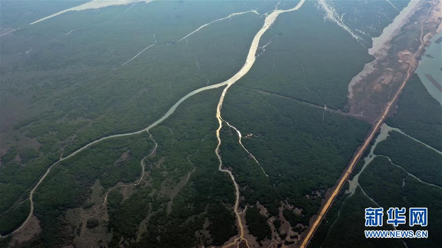 12月21日無人機拍攝的廣西合浦縣黨江鎮(zhèn)更螺圍出海口一景。冬日,廣西廉州灣海域風光別致。新華社記者張愛林攝