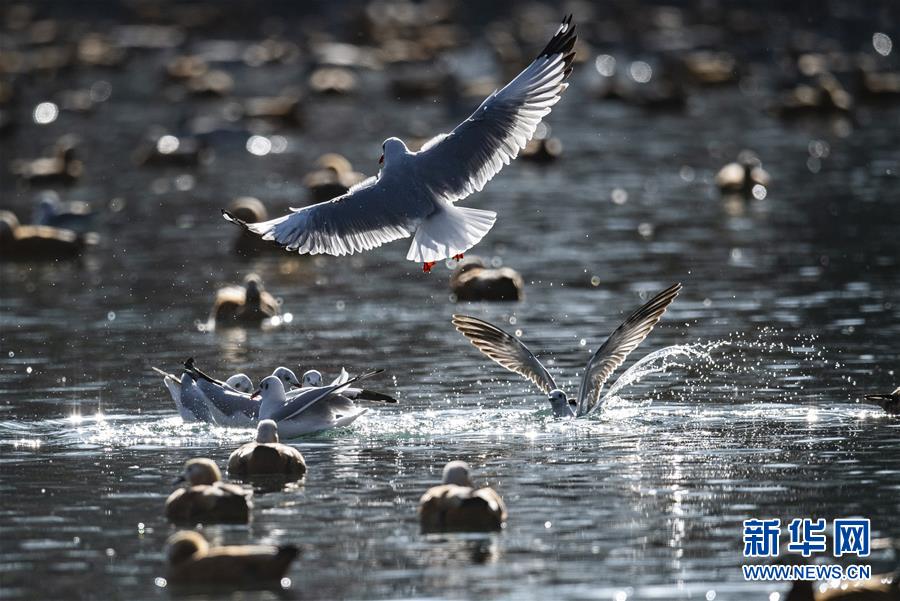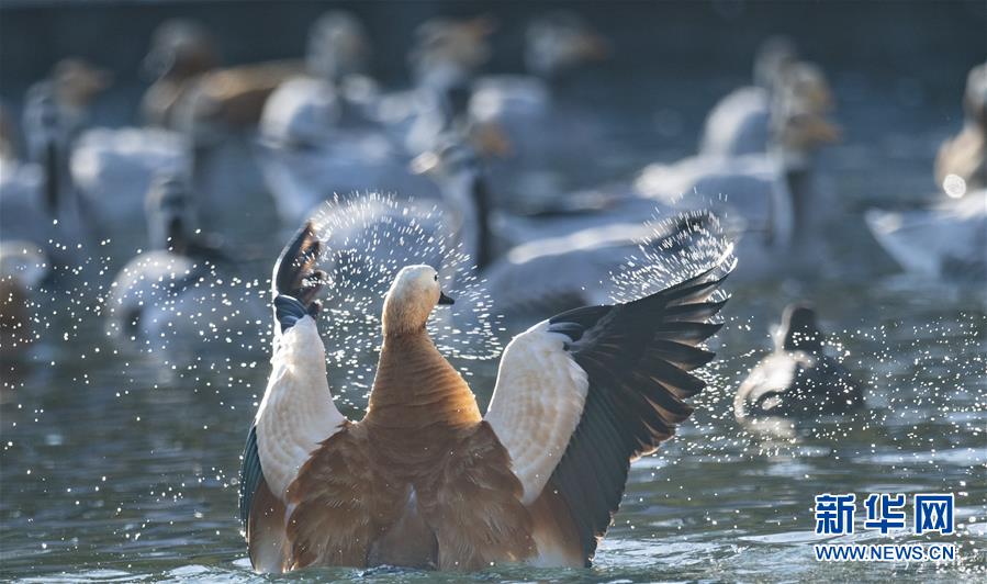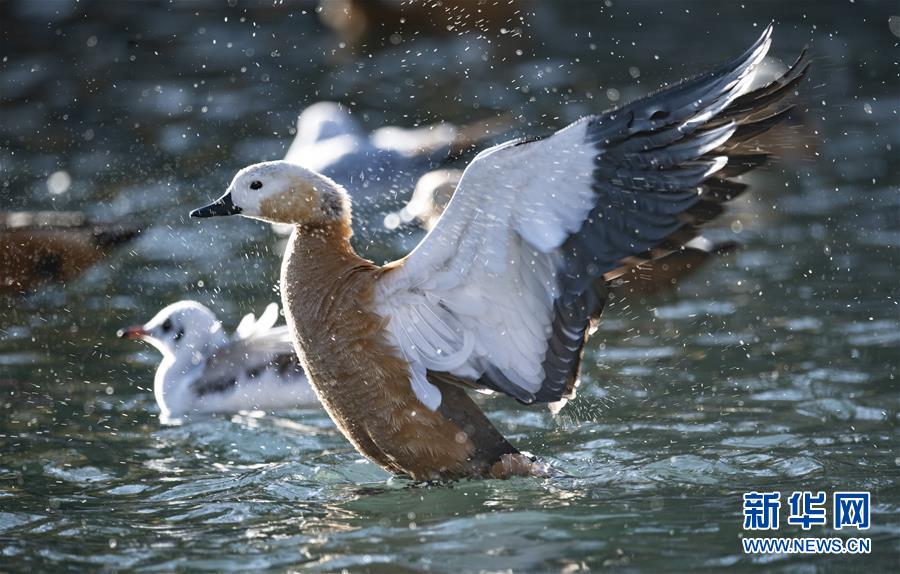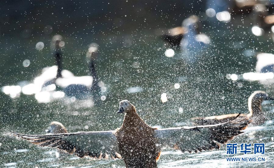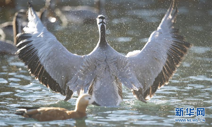 11月21日,候鳥在拉薩龍王潭公園水中嬉戲。時(shí)下,斑頭雁、紅嘴鷗等不少候鳥陸續(xù)飛抵拉薩河谷、雅魯藏布江沿岸等地避寒。新華社記者普布扎西攝