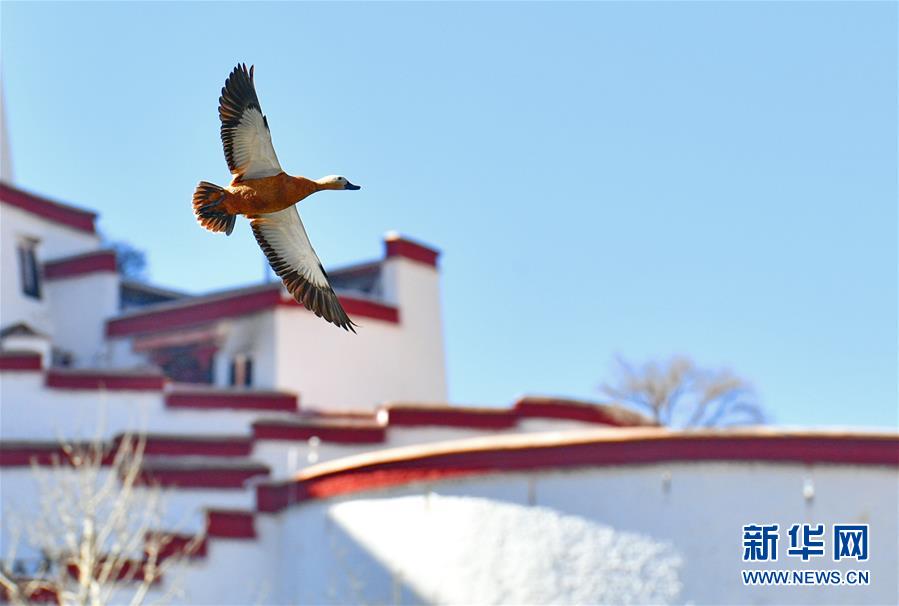 一只赤麻鴨從布達(dá)拉宮旁飛過(12月20日攝)。新華社記者張汝鋒攝