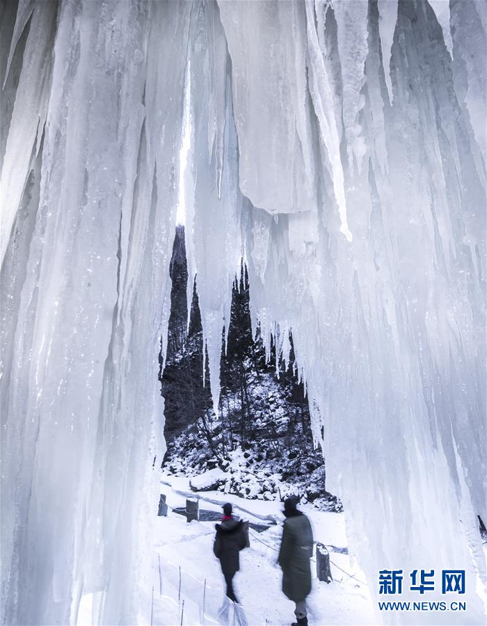 游人在吉林省長(zhǎng)白縣十五道溝望天鵝景區(qū)內(nèi)觀賞冰瀑景觀(1月3日攝)。新華社記者張楠攝
