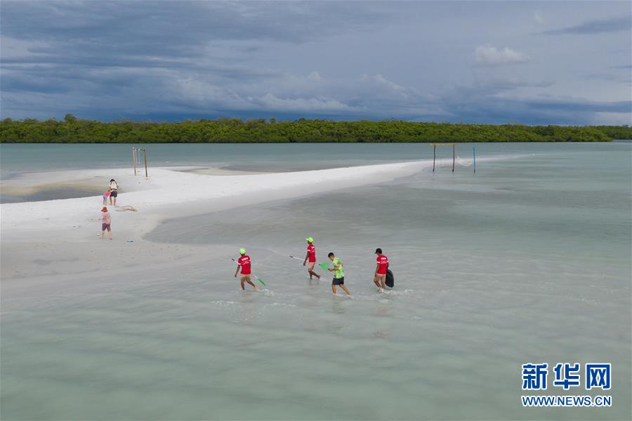 12月8日,在印度尼西亞邦加勿里洞省,李嘉文(左下)帶領(lǐng)工人在李王島的白色海床清理垃圾(無(wú)人機(jī)拍攝)。 新華社記者杜宇攝