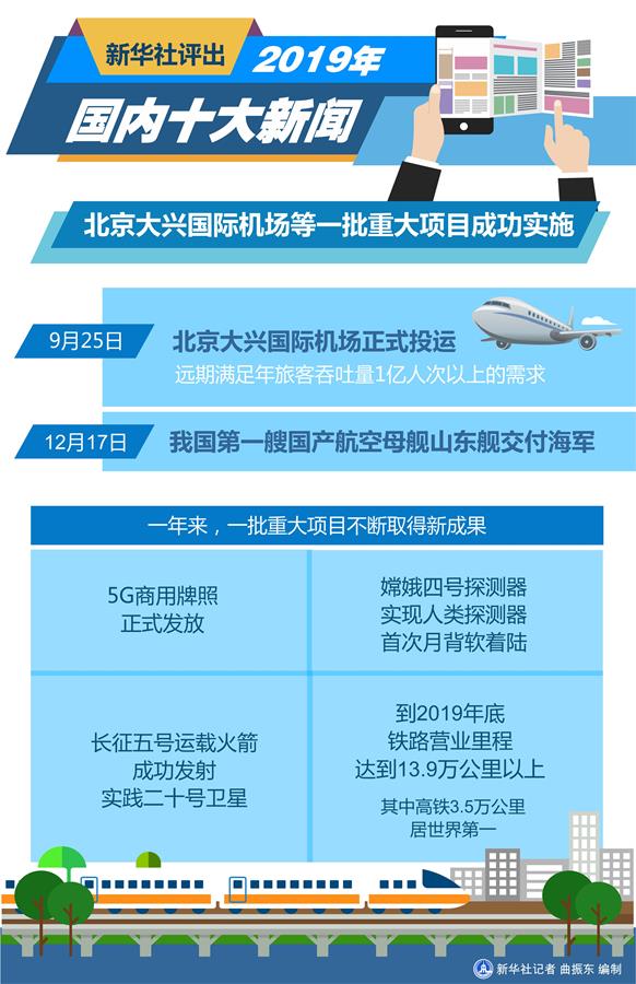 9月25日,北京大興國際機場正式投運,遠(yuǎn)期滿足年旅客吞吐量1億人次以上的需求。12月17日,我國第一艘國產(chǎn)航空母艦山東艦交付海軍。一年來,一批重大項目不斷取得新成果:5G商用牌照正式發(fā)放;嫦娥四號探測器實現(xiàn)人類探測器首次月背軟著陸;長征五號運載火箭成功發(fā)射實踐二十號衛(wèi)星;到今年底,鐵路營業(yè)里程達到13.9萬公里以上,其中高鐵3.5萬公里,居世界第一。