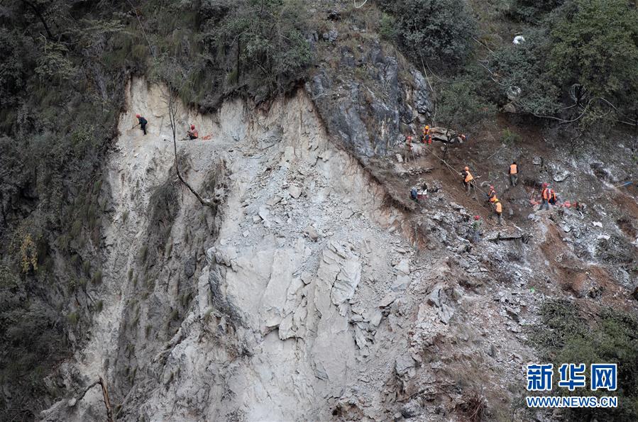 四川路橋施工隊伍在陡崖上作業(yè)(2019年11月20日攝)。阿布洛哈村通村公路施工遇到陡崖夾溝地勢,項目進程艱難緩慢,四川路橋施工隊伍開始在峽谷兩端分頭推進。新華社記者江宏景攝