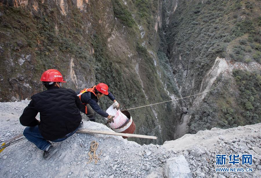 四川路橋的施工人員通過臨時(shí)搭建的溜索運(yùn)輸施工物資到峽谷對岸(2019年11月20日攝)。阿布洛哈村通村公路施工遇到陡崖夾溝地勢,項(xiàng)目進(jìn)程艱難緩慢,四川路橋施工隊(duì)伍開始在峽谷兩端分頭推進(jìn)。新華社記者江宏景攝