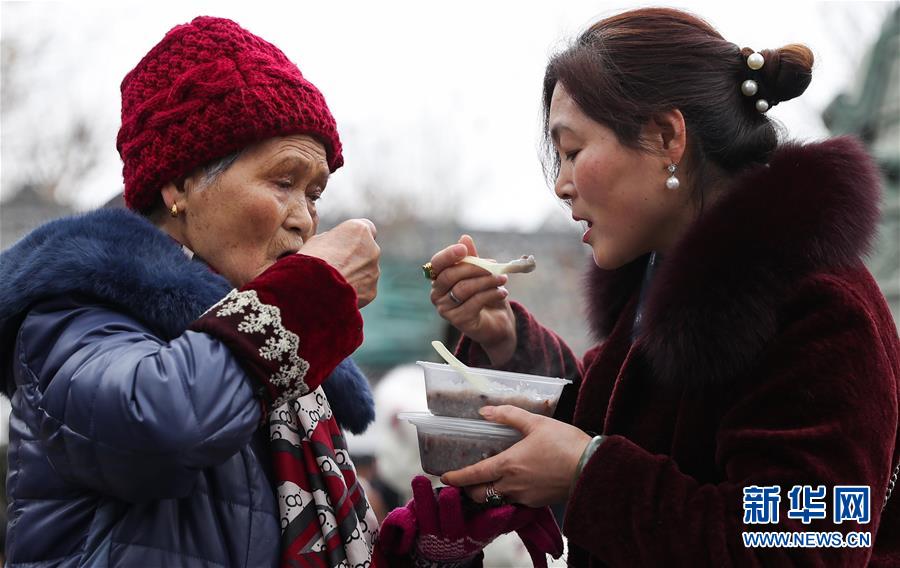 1月2日,兩位市民在閬中古城貢院廣場吃臘八粥。 當(dāng)日是農(nóng)歷臘月初八臘八節(jié),四川閬中古城舉行“萬人同品臘八粥”活動,當(dāng)?shù)鼐用窈捅姸嘤慰驮谪曉簭V場免費(fèi)享用臘八粥。 新華社記者 江宏景 攝