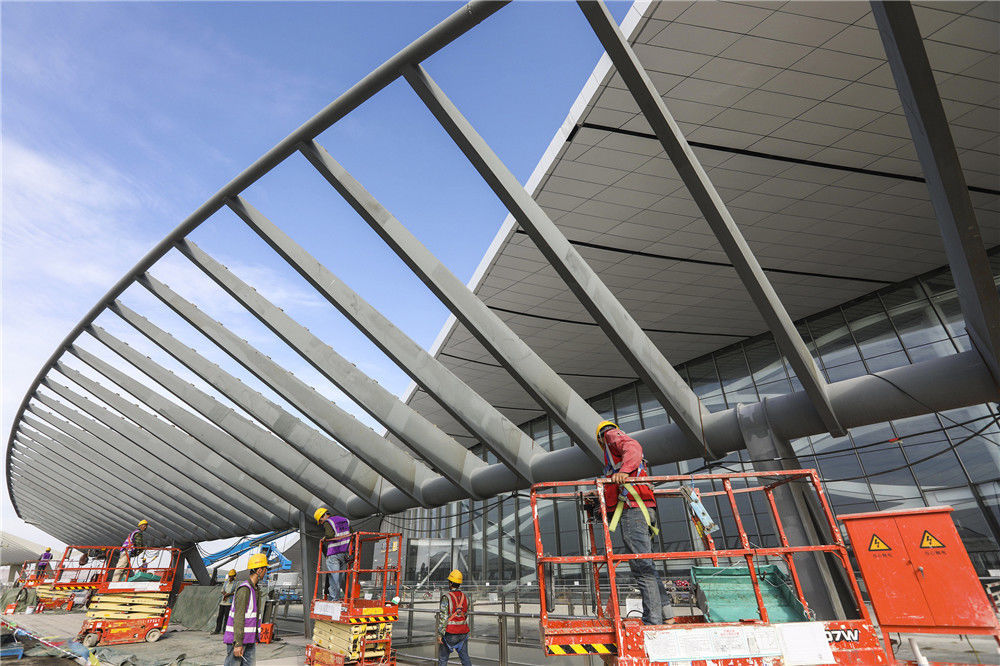2019年4月26日,北京大興國(guó)際機(jī)場(chǎng)將于9月底正式通航。工程建設(shè)進(jìn)入總攻階段,目前,航站樓內(nèi)部裝飾進(jìn)行收尾的工作。武輝/千龍圖像/視覺(jué)中國(guó)
