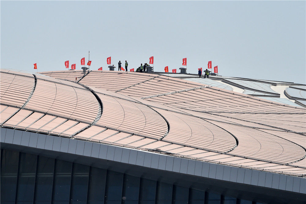 2018年12月19日,北京大興國(guó)際機(jī)場(chǎng)航站樓的屋面已基本完工,一只金色“鳳凰”完整地出現(xiàn)在北京城南。視覺(jué)中國(guó)