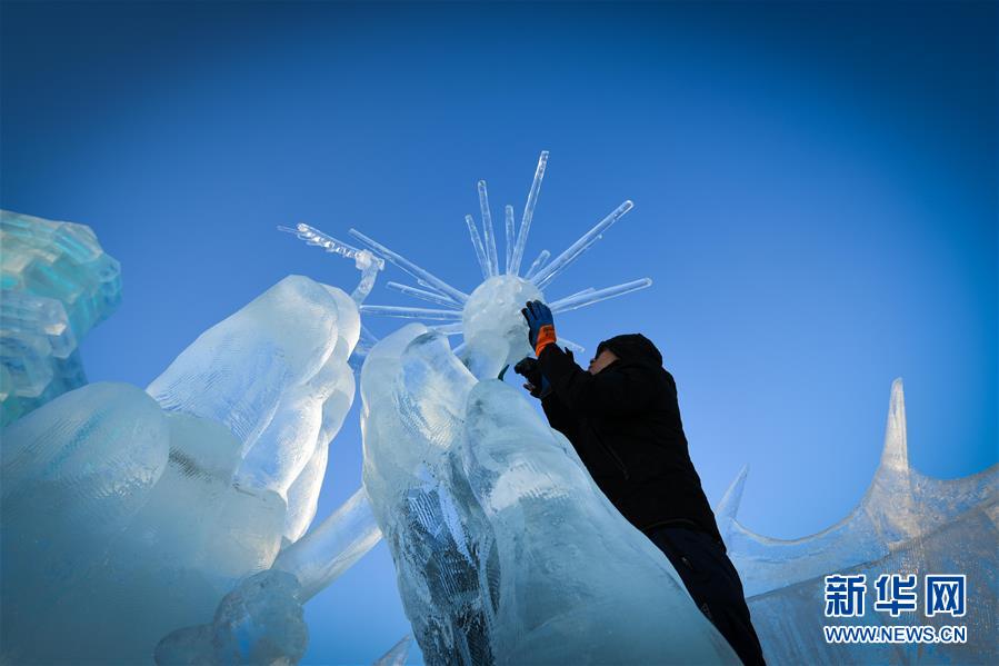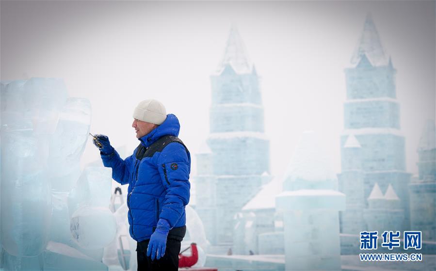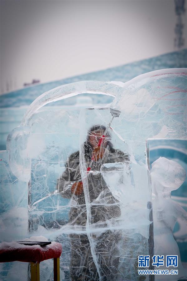 冰雕師在哈爾濱冰雪大世界內(nèi)雕刻冰雕作品(1月8日攝)。新華社記者王松攝