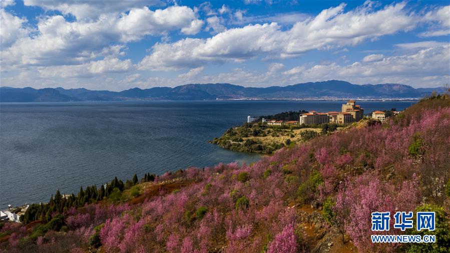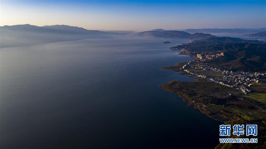 空中俯瞰撫仙湖(無人機照片,1月10日攝)。 來自云南省玉溪市撫仙湖管理局的數據顯示,撫仙湖2019年度保持一類水質,總磷、總氮等數值較2018年有所下降。 新華社記者 江文耀 攝