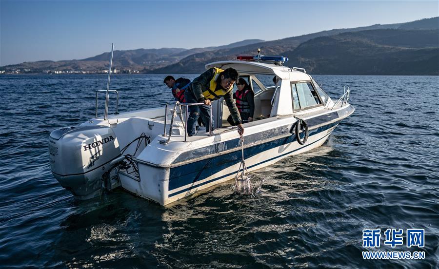 1月10日,云南省生態(tài)環(huán)境科學研究院的工作人員在撫仙湖取樣,進行月度水質監(jiān)測。 新華社記者 江文耀 攝