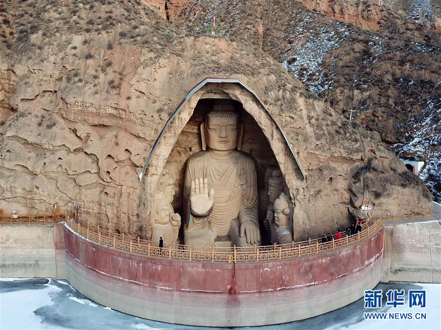 1月11日,游客在參觀天梯山石窟13號窟(無人機(jī)照片)。新華社記者馬寧攝