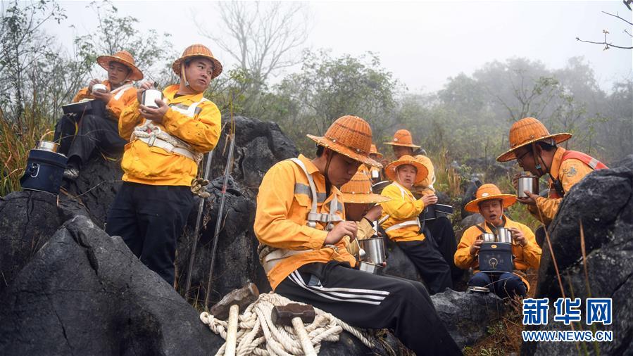 1月14日,百色工務(wù)段白水河橋隧工區(qū)班組成員在工作間隙吃午飯。在中國鐵路南寧局集團公司百色工務(wù)段白水河橋隧工區(qū),有一個由14名工人組成的班組。他們常年像“爬山虎”一樣行走攀爬在地形險峻、云霧繚繞的高山上,負責(zé)南昆鐵路轄區(qū)路段的搜山掃石工作,清除一切可能危害鐵路行車安全的因素,保障旅客出行安全。新華社記者張愛林攝
