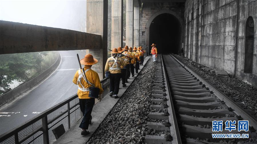 1月14日,百色工務(wù)段白水河橋隧工區(qū)班組成員開展巡查工作。在中國鐵路南寧局集團公司百色工務(wù)段白水河橋隧工區(qū),有一個由14名工人組成的班組。他們常年像“爬山虎”一樣行走攀爬在地形險峻、云霧繚繞的高山上,負責(zé)南昆鐵路轄區(qū)路段的搜山掃石工作,清除一切可能危害鐵路行車安全的因素,保障旅客出行安全。新華社記者張愛林攝