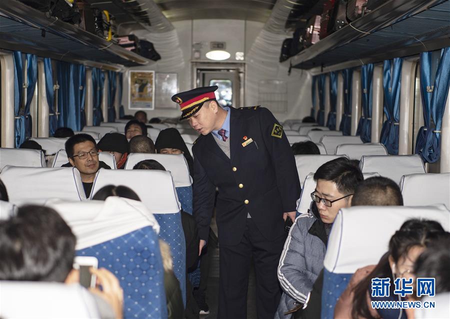1月11日,在太原開往青島北的K884次列車上,列車長(zhǎng)趙耀在檢查車廂衛(wèi)生情況。新華社記者 楊晨光 攝
