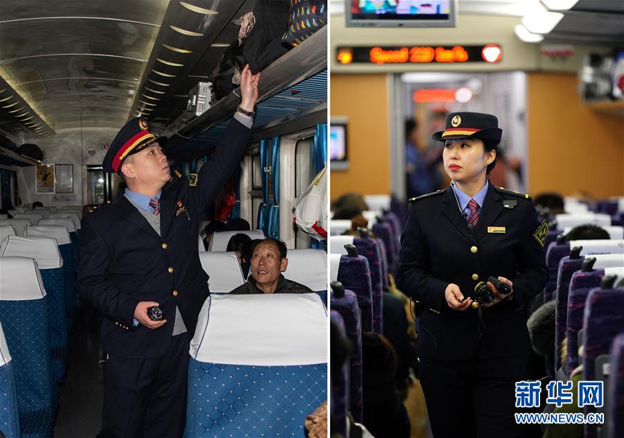 拼版照片左圖:在太原開往青島北的K884次列車上,列車長(zhǎng)趙耀在檢查旅客的行李擺放,確保安全(新華社記者楊晨光1月11日攝);右圖:在太原南開往西安北的D2507次列車上,列車長(zhǎng)陳海燕在車廂里檢查巡查(新華社記者詹彥1月11日攝)。新華社發(fā)
