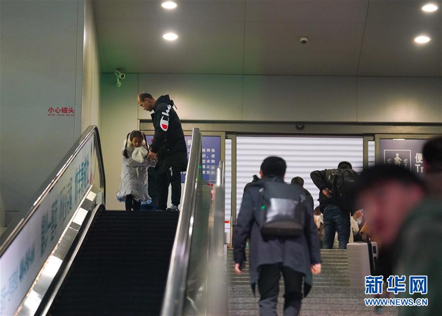 1月3日晚,朱梓芮(左一)在父親朱晨的陪同下前往南昌西站站臺準(zhǔn)備與母親團(tuán)聚。新華社記者 胡晨歡 攝