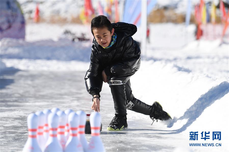 1月18日,游客在新疆天池景區(qū)玩冰上保齡球。