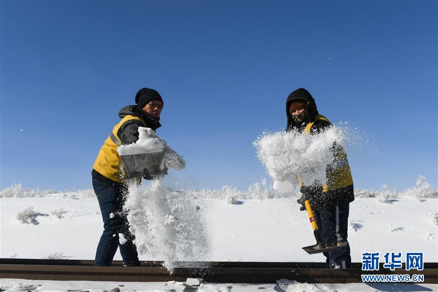 1月13日,白音庫倫綜合維修車間職工在作業(yè)點(diǎn)清理積雪。新華社記者劉磊攝