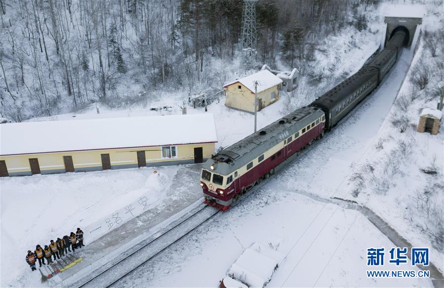 1月7日,西羅奇維修工隊(duì)工作人員在雪地上寫下“一路平安”為經(jīng)過的列車旅客送上祝福(無人機(jī)照片)。新華社記者王毓國攝