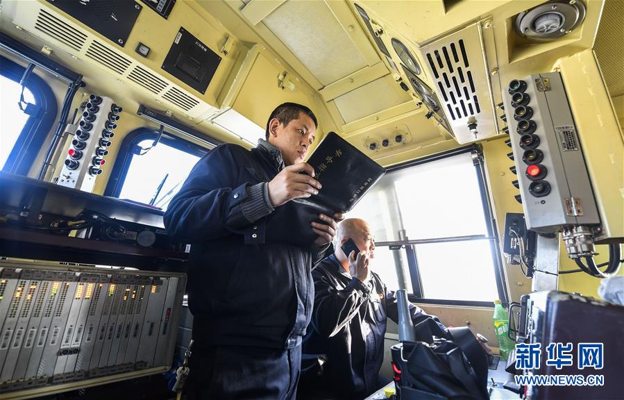 機車司機杜洪峰(右)與副司機謝振國進(jìn)行開車前的例行檢查(1月17日攝)。新華社記者許暢攝