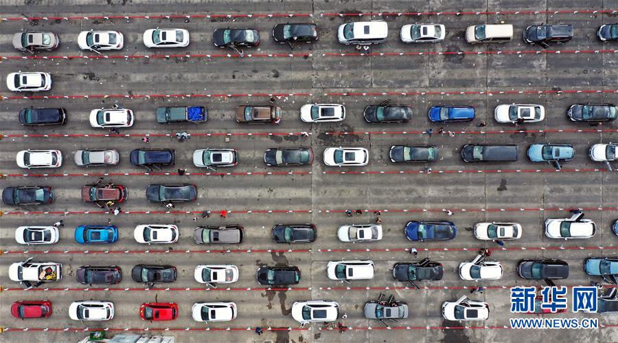 1月19日,車輛在??谛阌⒏圯喍纱a頭等待登船(無(wú)人機(jī)照片)。 新華社記者 郭程 攝