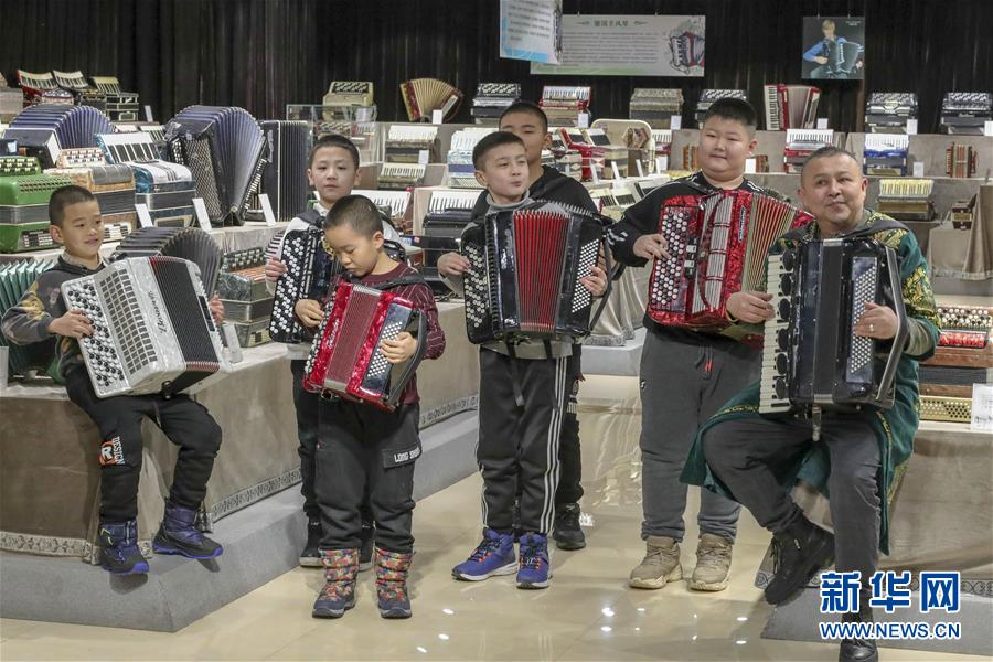 在塔城市手風(fēng)琴博物館,當(dāng)?shù)匚乃噽酆谜邽橛慰脱葑嗍诛L(fēng)琴(1月21日攝)。新華社記者 趙戈 攝