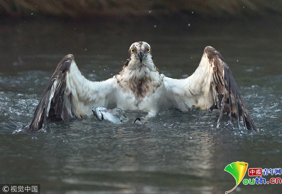 魚鷹潛入湖中捉鱒魚